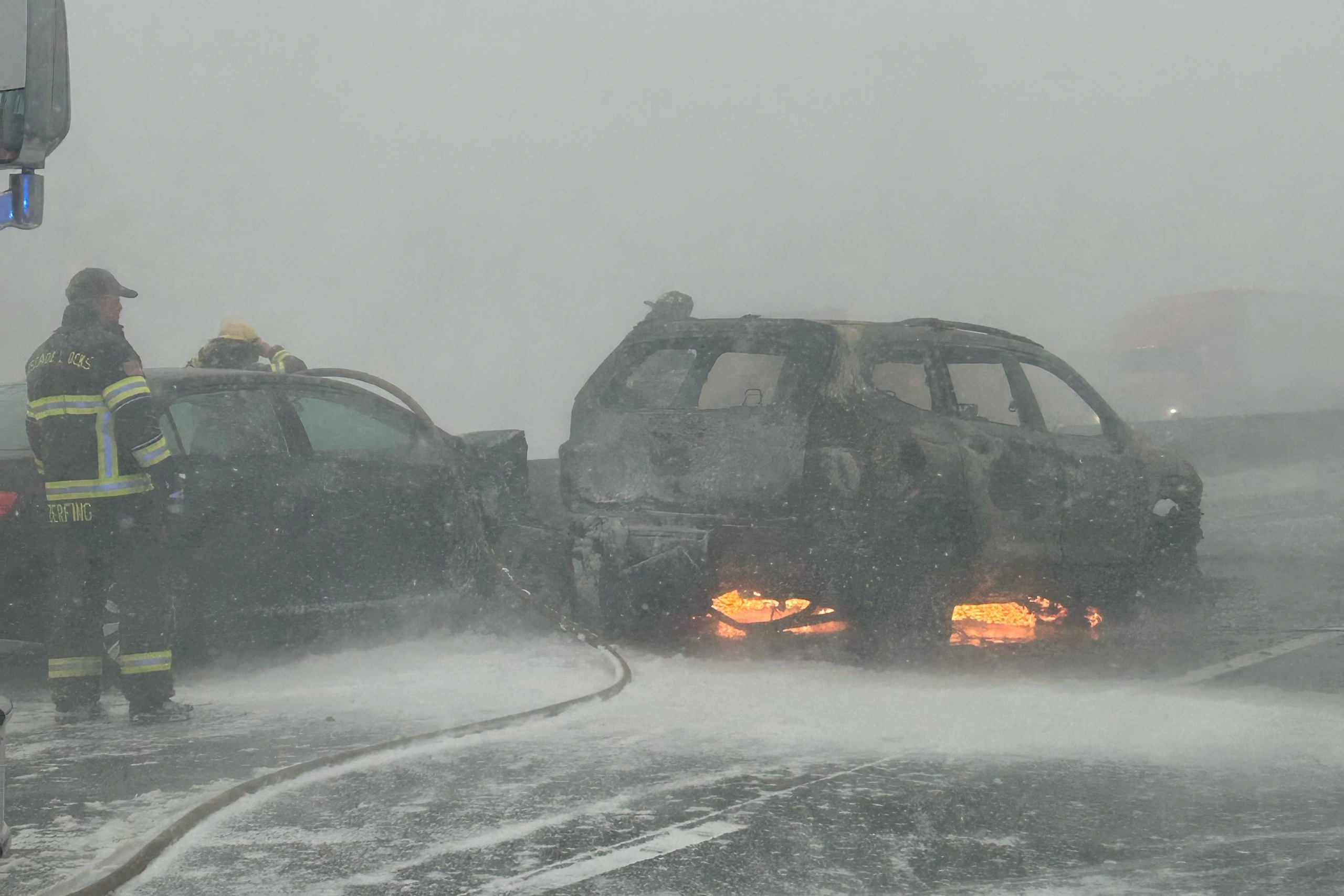 Giới chức địa phương cho biết hiện trường vụ tai nạn bị phủ trắng xóa bởi gió và tuyết, khiến công tác kiểm đếm số lượng phương tiện gặp nạn gặp nhiều khó khăn.